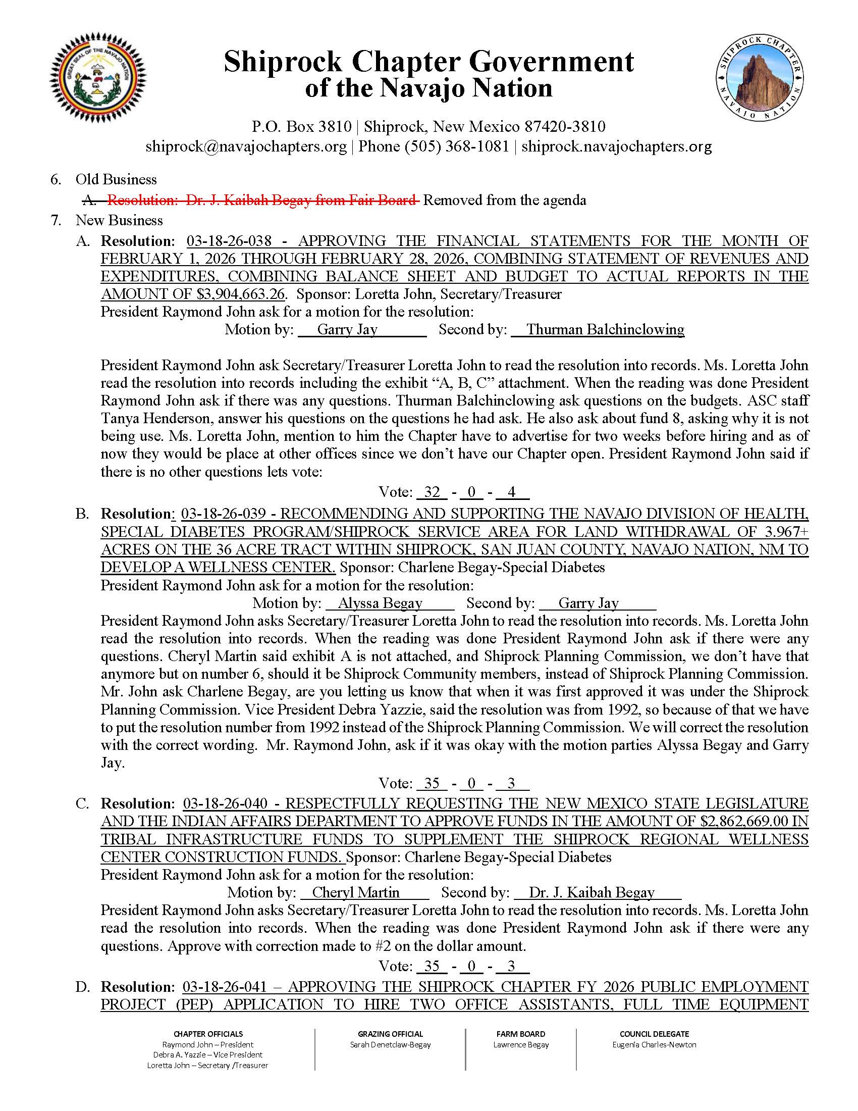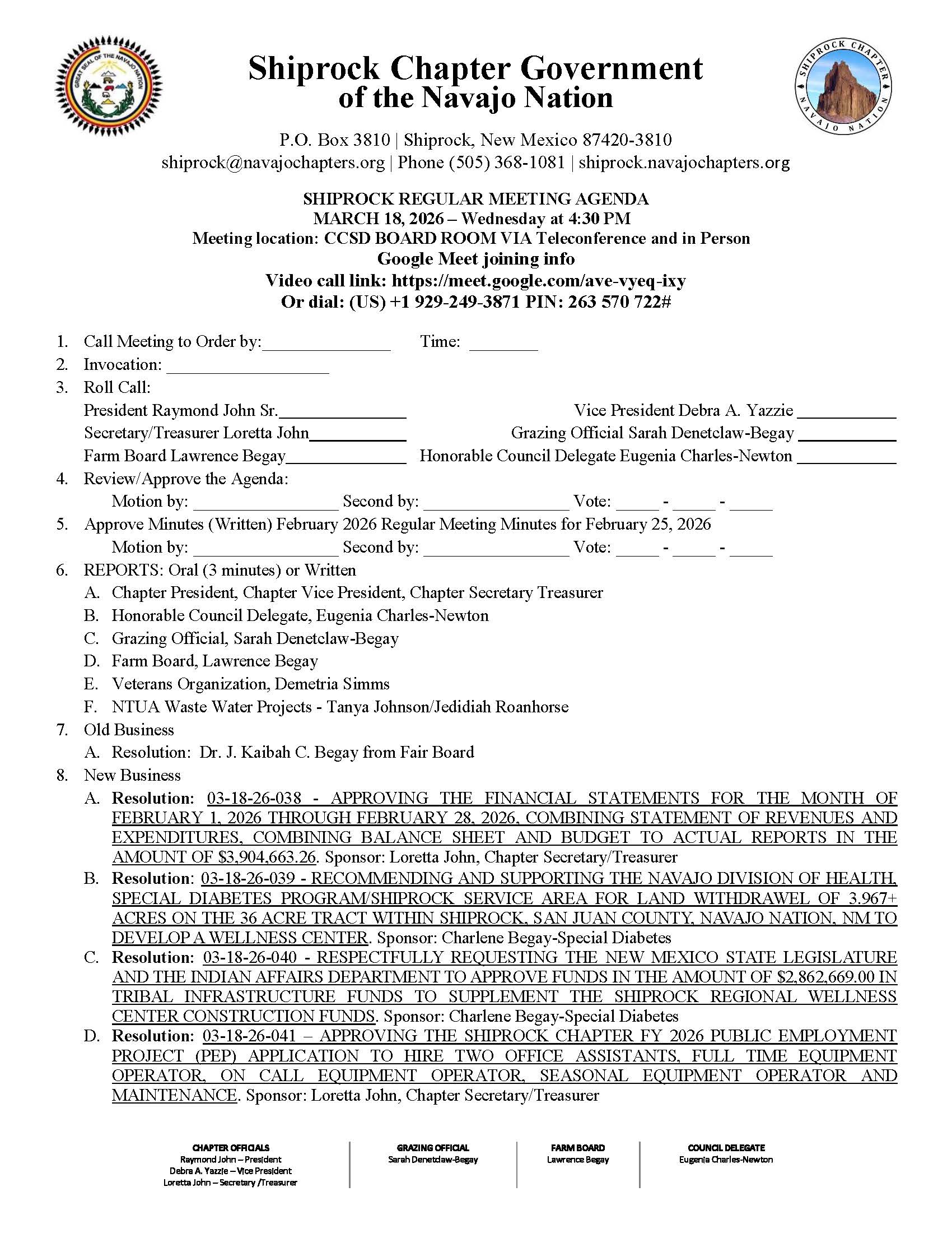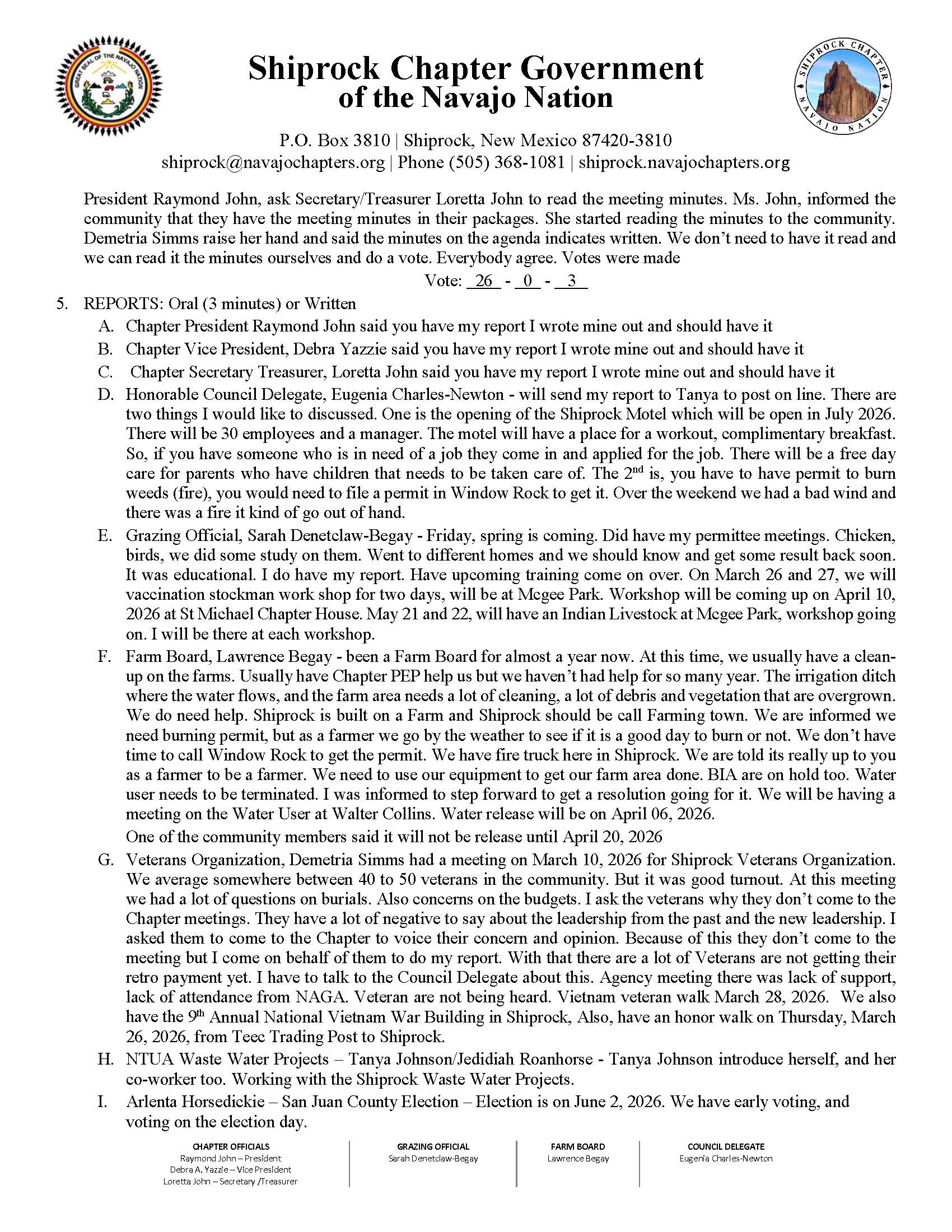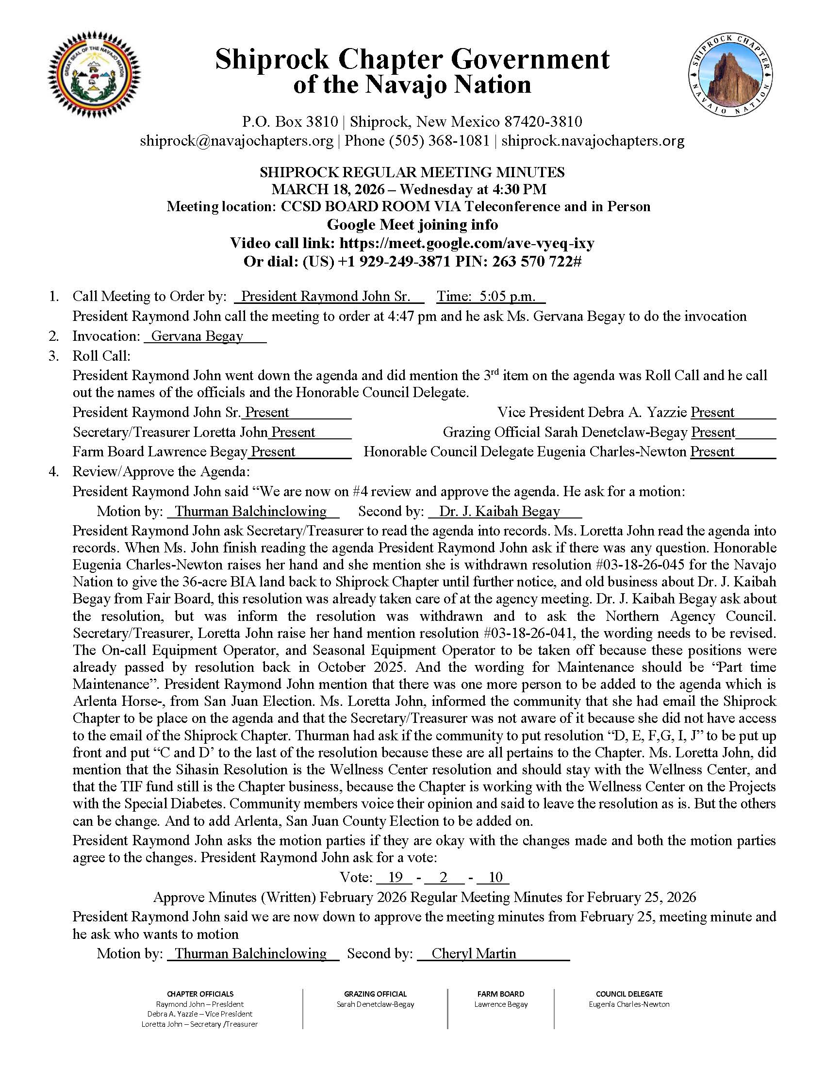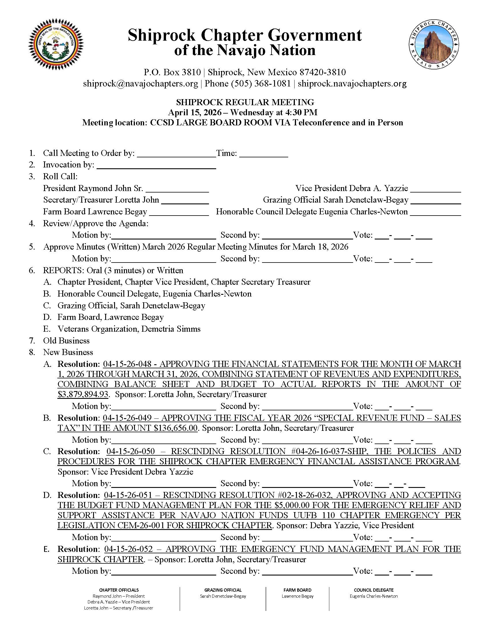 Shiprock Chapter Regular Meeting Agenda 03/18/26- Download Here⇐