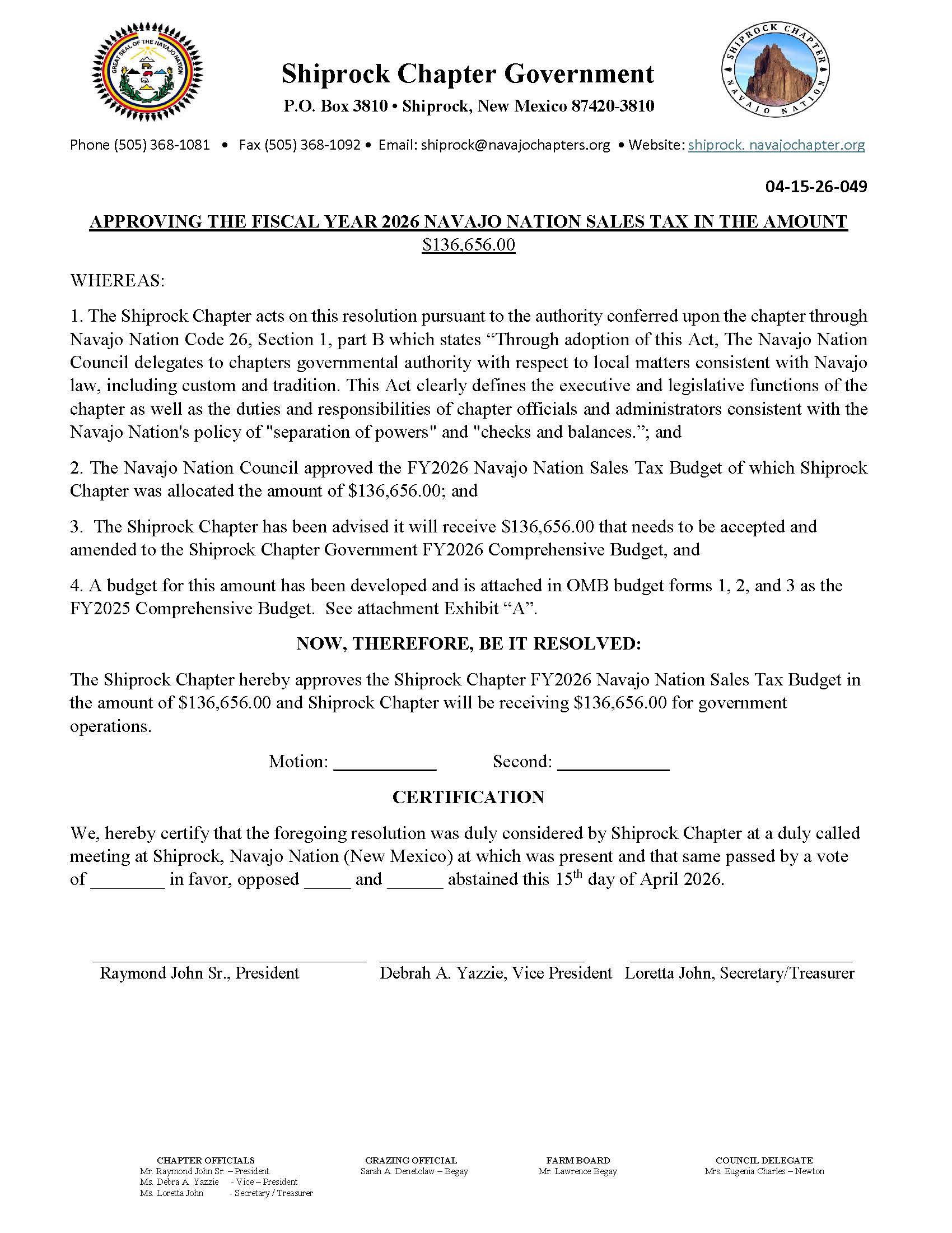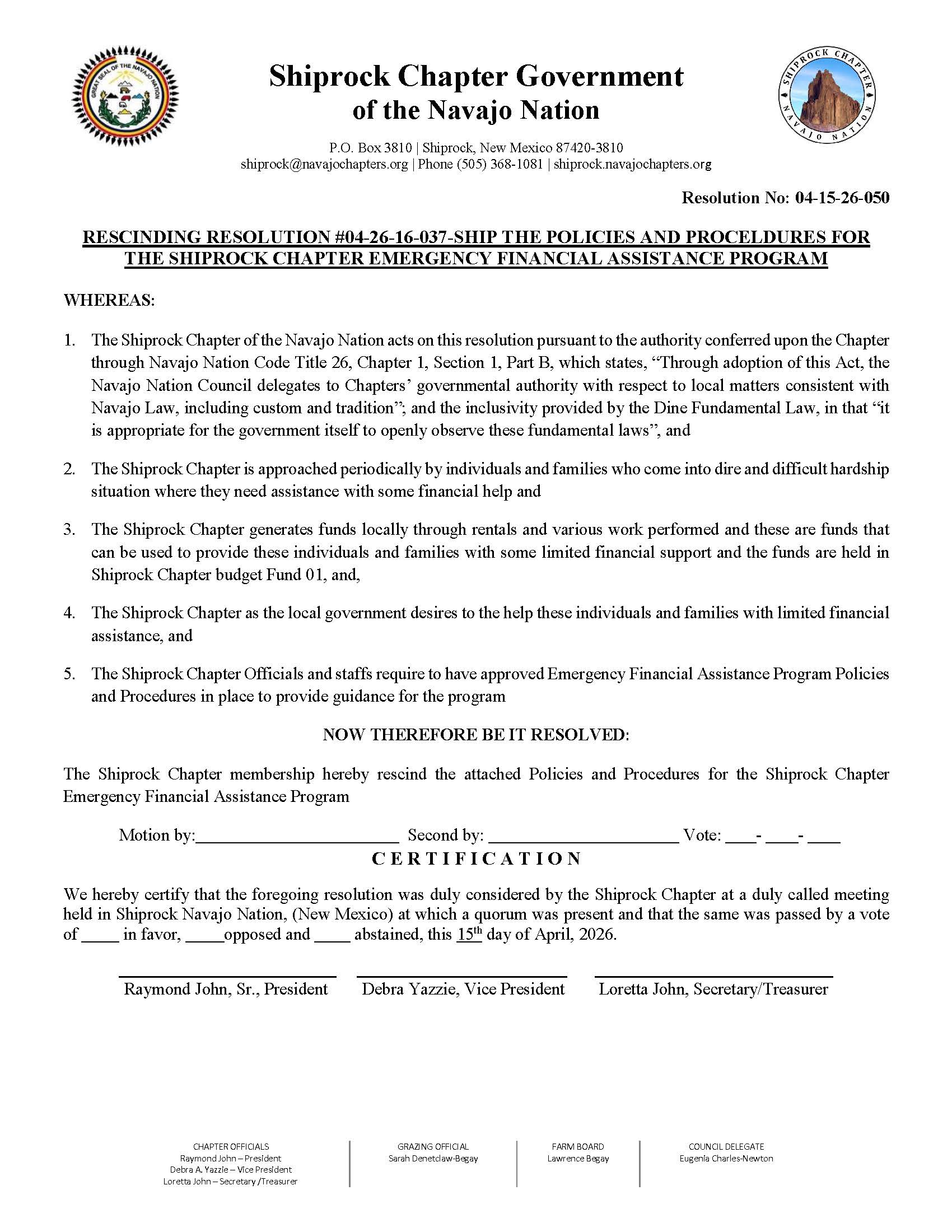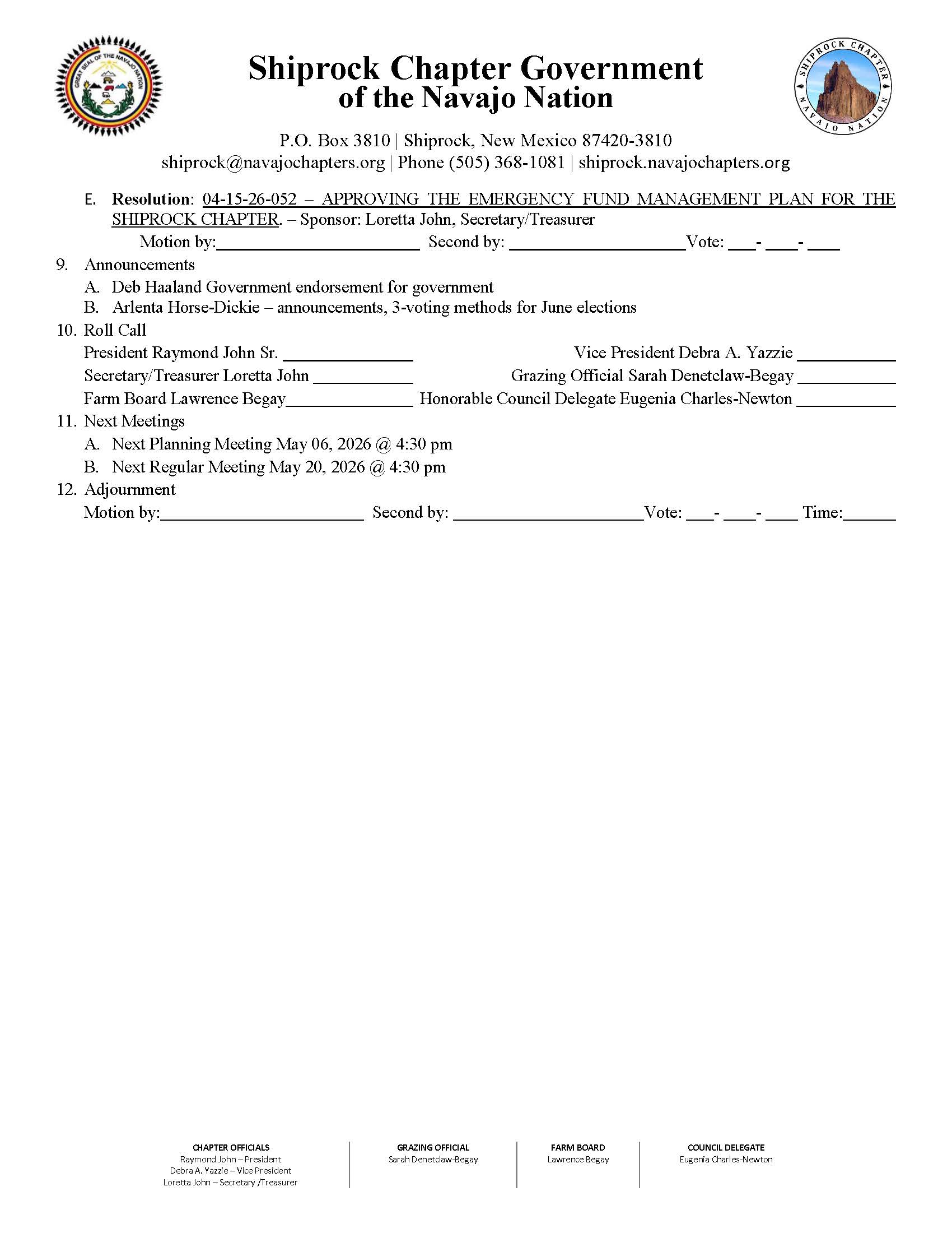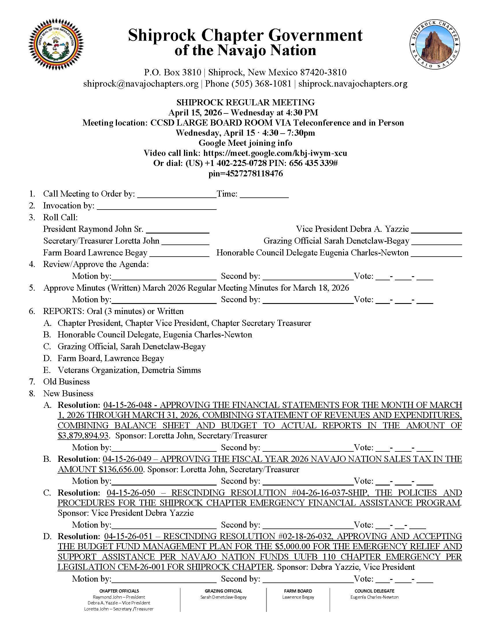 Shiprock Chapter Regular Meeting Agenda 04/15/26- Download Here⇐
